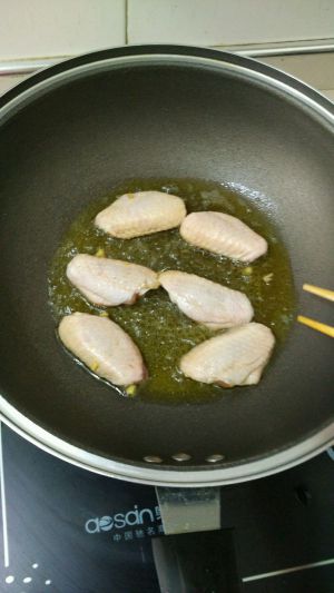 热锅到油,油7分热放鸡翅煎至金黄,煎至过程中要来回翻面