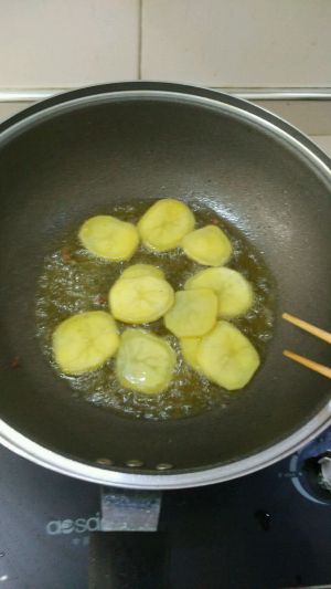 锅里留底油炸土豆片,炸到8成熟即可起锅备用