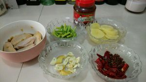 姜,蒜切片,干辣椒切段凉水泡下,土豆切片,蒜苔切段备用