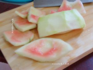 西瓜皮上留少许红瓤,削去绿色的硬皮,切成小块。