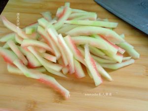 西瓜皮去红瓤,可以稍微留下点,颜值会比较高。再切成细细的条。
