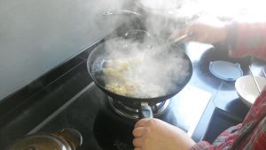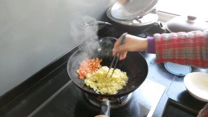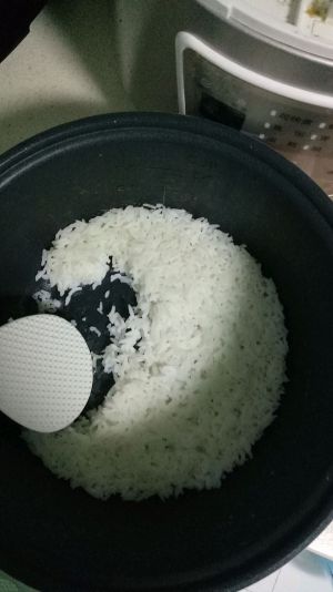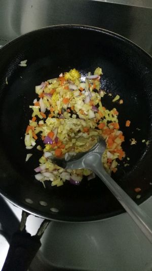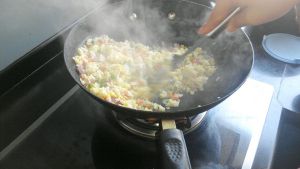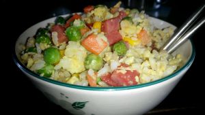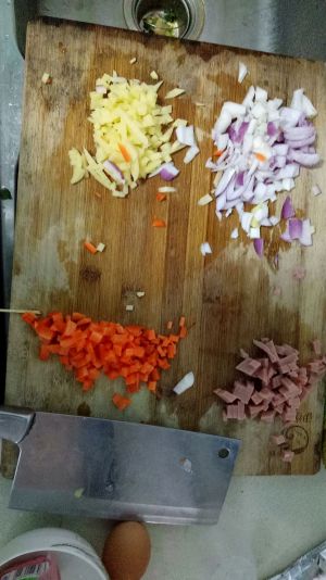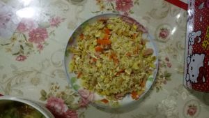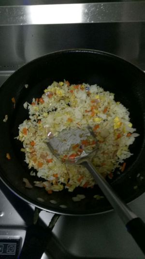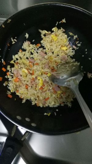 准备好剩米饭与其他材料一同大火烹炒,这个米饭的图是某天我心血来潮为老公准备的爱心芝麻,拿来冒充和小小得瑟一下,哈哈