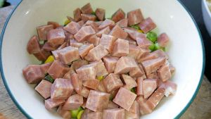 继续翻炒三分钟,加适量盐,放入午餐肉
