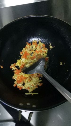 把胡萝卜放油里炸。(我是先煮青豆玉米的)