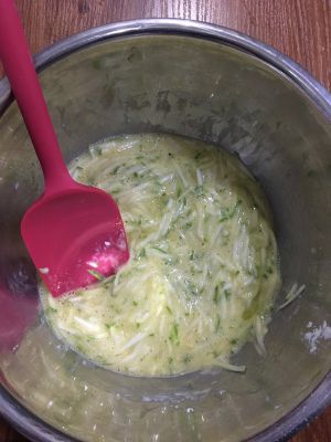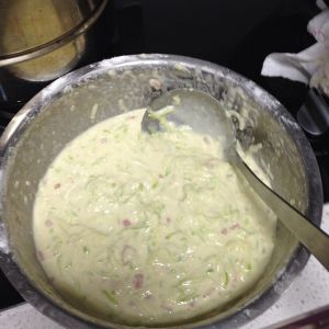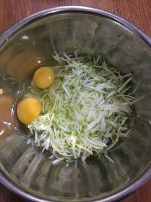 等西葫芦腌出水后 将面粉倒入盆中 并打鸡蛋打进里面 和成面糊 并将培根和奶酪切碎 放入面糊搅匀