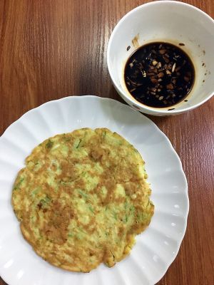 待饼的底部凝固微焦,把饼翻转,也煎至微焦,盛起,再煎另一块,直到把面糊煎完;