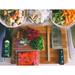 肉类食材水中煮熟,素菜煮至九成熟备用。