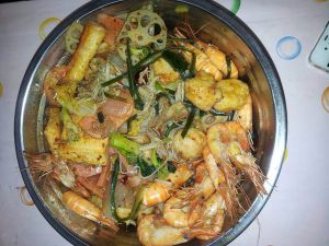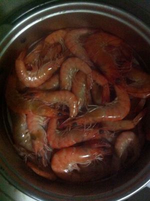 第3步:用牙线将虾线剔除。淘洗干净。这一步需要的时间比较长。这样安排时间正好菜可以沥干。 我是坚持在能炒出来的情况下少用油。海底捞的麻辣香锅调料里,一包有两小袋,每一小袋正好炒差不多一锅。调料里面也会有油的。