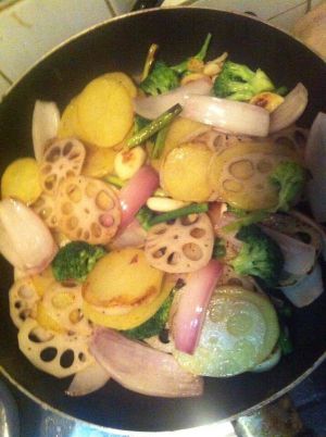起锅到油,所有蔬菜依据耐熟程度放入翻炒,炒熟后倒入适量麻辣香锅料。