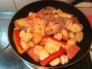1.下姜片、蒜瓣、火锅底料一小块、郫县豆瓣酱一勺。炒香。 2.依次倒入胡萝卜片、火锅丸、牛肉卷等食材。 3.整个过程不要放一滴水,不停翻炒,防止糊锅。