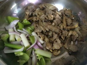 所有食材倒进去翻炒,再加入一勺葱伴侣辣椒酱。再倒入半听啤酒,焖至收汁。