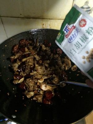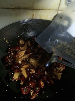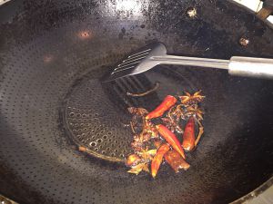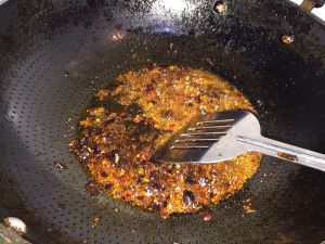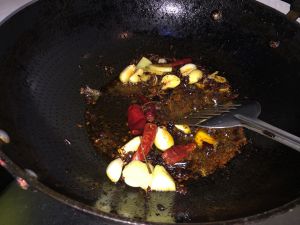 干辣椒和八角香味逼出以后,滤出来丢掉!然后放海底捞火锅底料翻炒!可以加一点老干妈