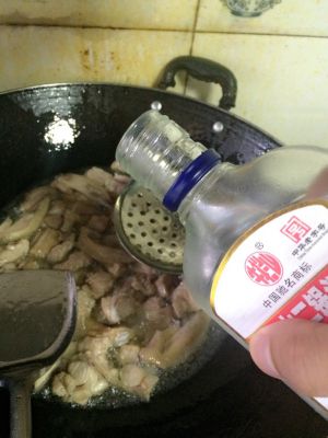 放油,下鸡肉加白酒两勺,大火炸五分钟以上,至金黄后起锅。