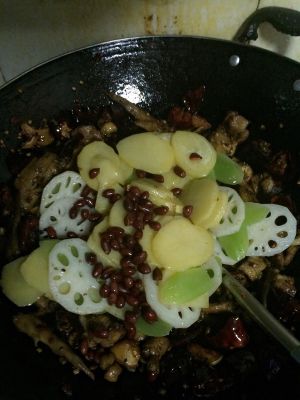 把菜倒入锅中进行翻炒,不停的用铲子翻锅底吧。加入王家渡的麻辣香锅底料。加少量开水翻炒入味儿。都炒熟为止。