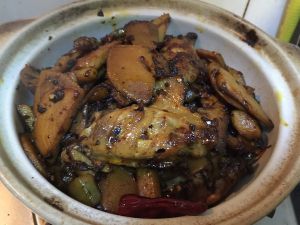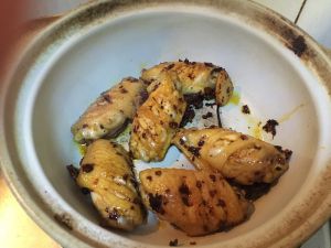 鸡翅炒到金黄色后用筷子夹到已经烧热的小砂锅中,加一点花椒油,小火煎