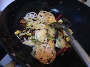 然后依次放入,豆瓣一大勺爆香,干辣椒,青花椒,爆香。