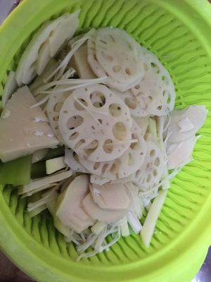 加炸好的所有菜,加适当盐,大火翻炒半分钟。