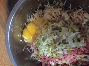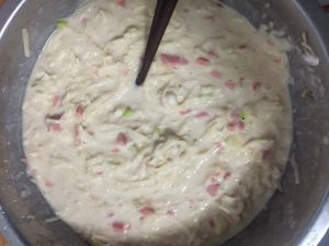将玉米粒、面粉、鸡蛋、葱花、盐、耗油放入捣碎的土豆泥中(我多加了一点火腿肠(*^ω^*))