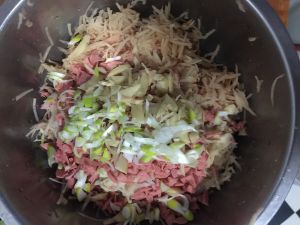把土豆擦丝,火腿肠切丁,葱花!