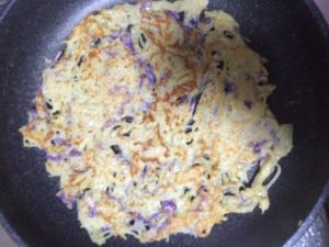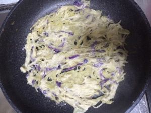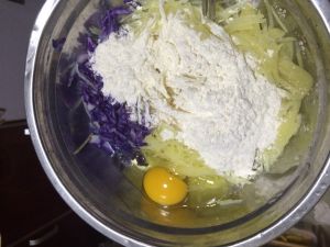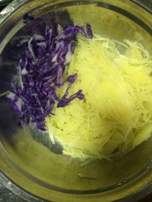 土豆丝甘蓝丝放热水焯2分钟,加入面粉、鸡蛋、调味品(因为早餐我喜欢低油,用的韩国麦饭石锅,加入一点点油就不沾,所以土豆丝提前焯一下更容易熟)