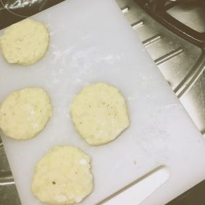 土豆煮熟,打成泥。加入面粉、黄油、适量盐与黑胡椒搅拌,也可加点牛奶。做成饼状。