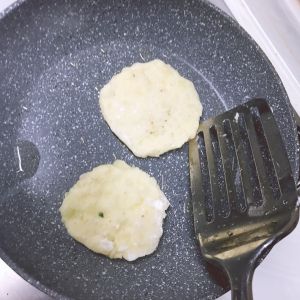 第三步:手上先抹一层油防沾,再放上面糊,整理成小饼,放入不粘锅,一面定型以后翻面,烙另一面!两面金黄熟透就可以啦!
