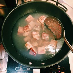 锅中放入500g水烧沸,下肋排块煮至无血水捞出沥干备用