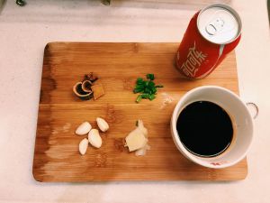 葱段切成葱花,蒜肉切成蒜末,姜片适量,生抽和老抽各两汤匙兑少量水备用,可口可乐一罐,八角桂皮5g