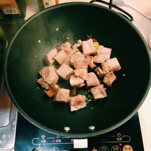 锅中放入3汤匙油烧热,下姜片、桂皮八角、蒜末和肋排炒香