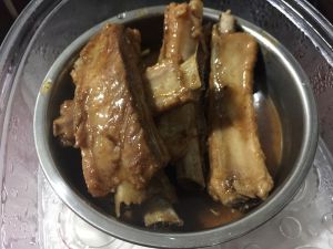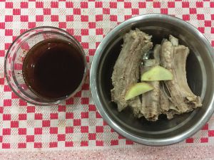 排骨可略焯水。我这次直接用煲汤汤渣一字排骨。我家小鱼生比较喜欢吃一字排,因为脂肪比较少,他也方便拿着吃。