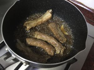 酱油均匀敷在排骨上,加入可乐煮沸后,加入芡汁,收汁就完成了。