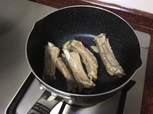 热锅,下油爆炒姜片,再放入排骨,再加酱油炒均匀。
