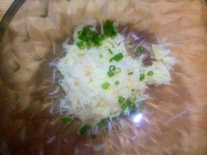 将鱿鱼洗净切小粒。胡萝卜,卷心菜分别切碎备用。玉米粒洗净。然后将图中配料焯水后,控干水份放入土豆泥中,加入适量盐,黄油,黑胡椒粉,适量淀粉搅拌均匀。