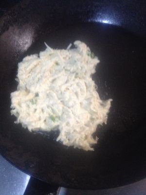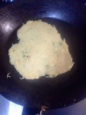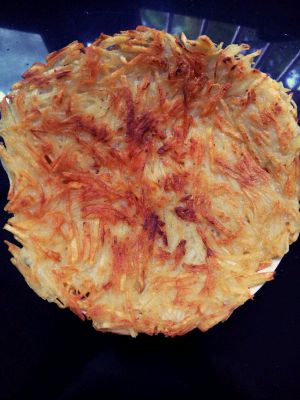 锅中倒入油后再倒入土豆丝,用菜勺将其摊平煎至两面金黄即可出锅