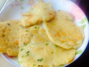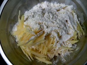 面粉淀粉二比一。在面盆中加入火腿丝、土豆丝、葱末儿、盐、糖、鸡蛋,搅拌成均匀面糊