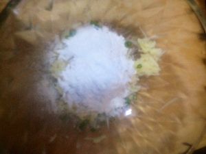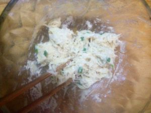 放入小麦粉,如果开始不清楚放多少,要一点点来,若太干,就放稍许水,直到可以稠度合适