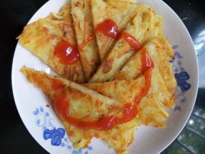 出锅后切块,在上面加番茄酱或胡椒粉或辣椒粉就随便亲咯