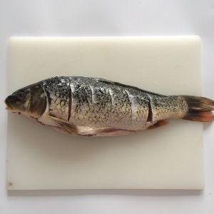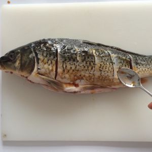 草鱼处理干净改花刀。 老姜切片捣出姜汁,再绑一小捆小葱,用小葱沾上姜汁涂抹鱼的全身去除腥味。 然后再抹上一层盐,抹盐的目的一是使鱼更加入味,二是入锅炸时不易碎。