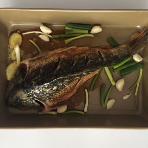 收拾干净,对半剖开,家里盘子小,长也给了一刀分开。全身抹盐,料酒,葱姜,涂层生抽,做个按摩腌制30分钟以上入味儿。。