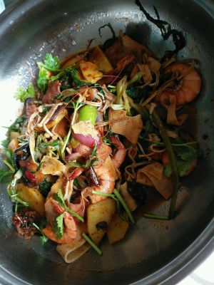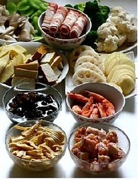 1.把蔬菜用水煮熟(豆皮,金针菇,,海带,空心菜,腐竹,海带,木耳)盛出待用 2.烧热油锅(稍微多写),把培根肉,土豆,大虾用油炸8分熟盛出待用