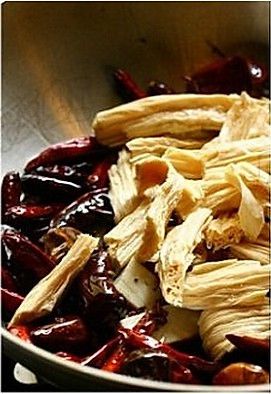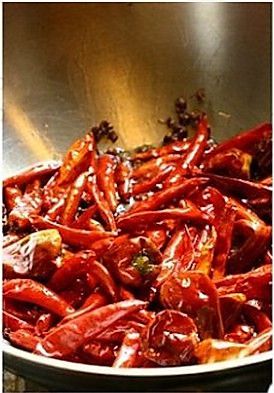 再下干辣椒、灯笼椒、郫县豆瓣酱炒香