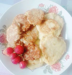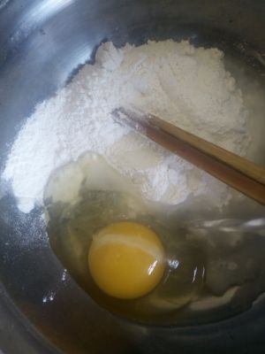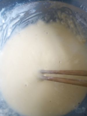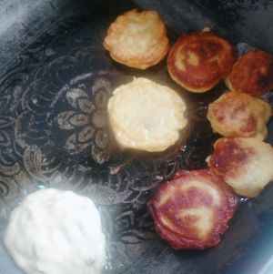 下锅,煎到两面焦黄。(热锅,先放入一小勺面糊,底面煎硬,放上馅,再一层面糊。翻面。)