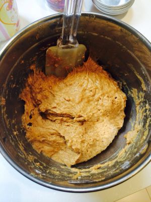 把晾到温的红糖水和粉类拌和,用刮刀,手不行,会粘在手上的,拌成这样一个面团,很粘手,一定要用工具。