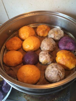 首先和面:1.白面一点点加水,以免一次加多稀了揉不成面团。再加酵母,继续揉,揉到“三光”(手光,盆光,面团表面光滑),先放一边。2.白面与玉米面按3:1混合(总量与1中白面相同),再按与1一样的方法和面,和好放一边。用湿毛巾盖在两个面团上,让它们发酵(醒一醒),大概30分钟左右能发好。 (没来得及拍照,不好意思^_^)