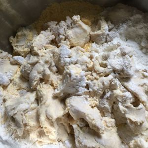 适量面粉放盆里,加入蛋黄、白砂糖、酵母菌粉,然后慢慢加入冲泡好的奶粉,用筷子搅拌成絮状