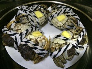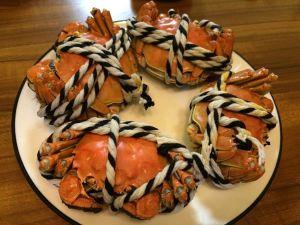 大闸蟹刷洗一下表面,反过来放在碟中,都说这样放油不会漏出来,不过如果蟹很肥还是会溢出来的,我喜欢看它们肚子上贴姜片的样子。