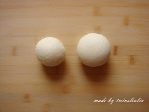 待面团发酵至原来的1.5至2倍大时就可以下剂子了。剂子的大小按个人喜好。将一份剂子分成两份,其中一份稍大一些,用于做小螃蟹的主体;另一份稍小,用于做小螃蟹的爪子。