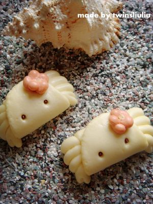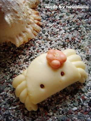 收拢花瓣,使花瓣向中心聚拢。用牙签取微量的白色面做花蕊,将花蕊固定在花朵中间。将花朵固定在小螃蟹上。