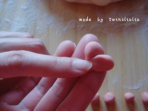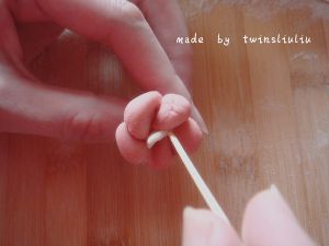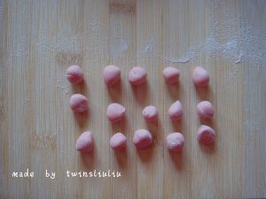 如果想更美观,还可以做朵小花做点缀。取一块原色面团,搓入少许红曲粉,揉成粉色面团,把粉色面团捏成颗颗小球,这是花朵花瓣的雏形。
