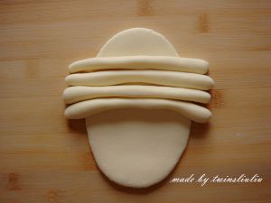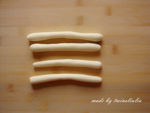 将做小螃蟹爪子的面团分成四份,搓成长条。其中一条比另三条稍粗一些,用来做大蟹钳。
